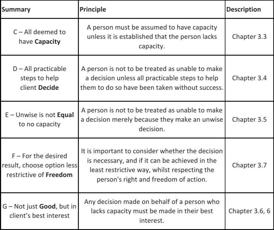 The Mental Capacity Act seeks to balance a person’s right to make their own decisions and the need to protect them where they lack mental capacity to make those decisions. The Act sets out the five statutory principles (Table below) that anyone making any decision or taking any action for a person who appears to lack capacity must apply.